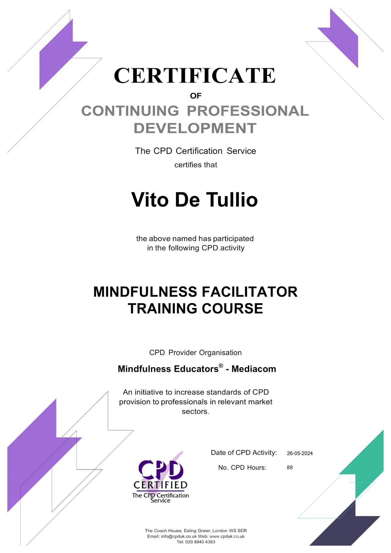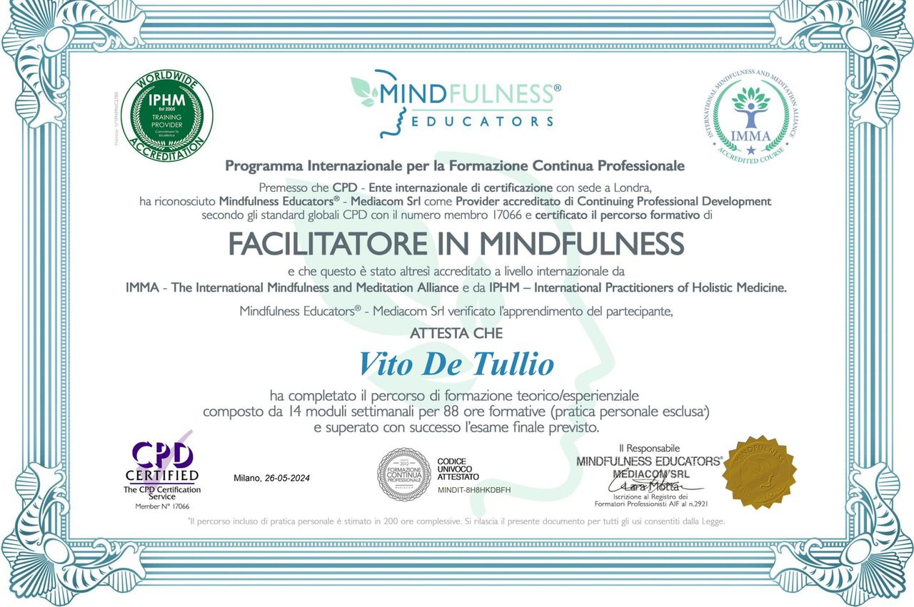 Avendo sperimentato su me stesso i benefici e gli effetti positivi della Mindfulness, sono diventato un facilitatore Mindfulness e inoltre sto terminando la mia ulteriore specializzazione in Mindfulness per diventare Istruttore Mindfulness e Specialista in interventi clinici basati sulla Mindfulness.